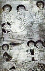 La miniatura del codice di Pray, raffigurante il corpo di Gesù mentre viene avvolto nel sacro sudario |
